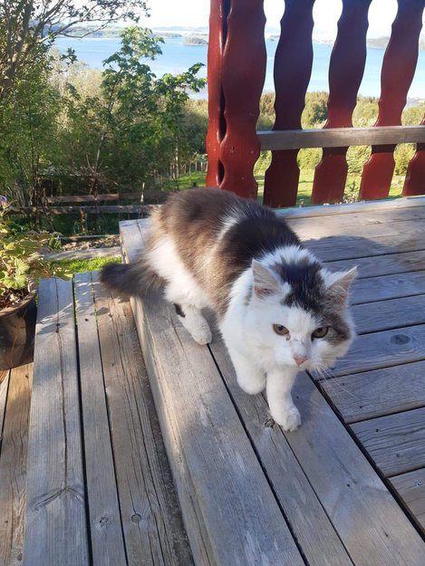 Ganske lita og lett. Svarte felt bak på bakbeina. Lodden pels og sopp i ørene ifølge dyrelegen. Ikke chippet, ikke sterilisert. Er tam og veldig kosete. Er husren.