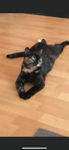 Hun blir 4 år nå i juni, men er liten og slank, lang tynn hale. Hun er sort, oransje og med noen hvite flekker. Chippet! Kattedo osv er satt ut uten hell..
