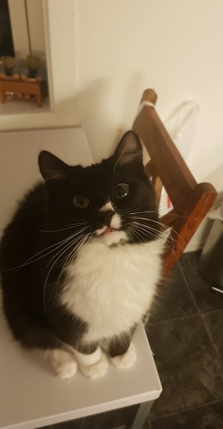 Har hvite poter, hals og mage, ellers helt svart. Ganske stor i størrelsen. Har nettopp klippet vekk en floke bak på ryggen, så kan lett kjenne han igjen om noen har funnet han.