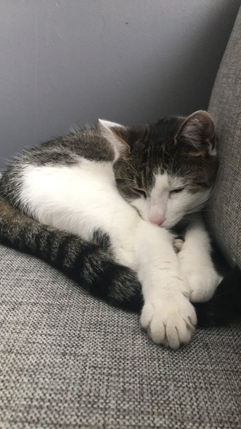 My er en liten katt. Mye Hvitt og litt makrellmønster. Hun har en øyekrok som er mørk og den andre lys. Ganske sky for andre mennesker ute dessverre, men ved observasjon ring!!
