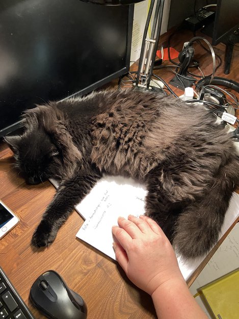Veldig lik andre sorte langhårede katter men er barbert flekkvis på ‘lår’ og ‘under armene’ . Ikke klippet ellers. Lyder plystring.