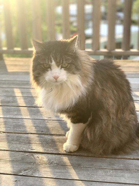 Svært uvanlig at katten er borte. 16 år og hjemmekjær. Frisk og fin. Leon har lang pels, en hale som er litt skjev innerst etter en gammel skade. Gammel grønn øretatovering samt chip. 2 andre katter i hjemmet som han er knyttet til.