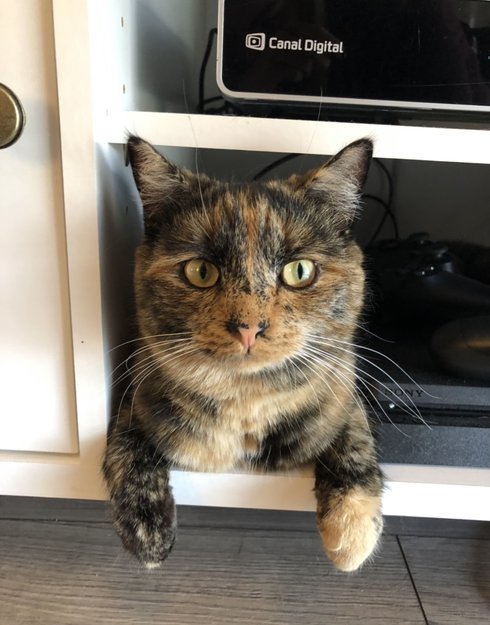 Kosete, snill og nysgjerrig pus. Tricolour, lys venstre fremlabb.