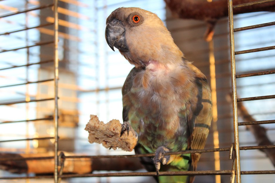 Dette er en 18 år gammel Rødbukspapegøye som i størrelse og fasong ligner på Senegalpapegøyer. Hun er 23 cm. lang, veier 145 gram og er ringmerket på høyre ben. Hode, kropp og vinger er grågrønn, magen og undersiden av halen er lysegrønn. Hun har orange pupiller og har plukket seg bar for fjær på et området på brystet. Hun har skrik som kan høres langt unna, og noen plystrelyder som ikke ville fugler har.