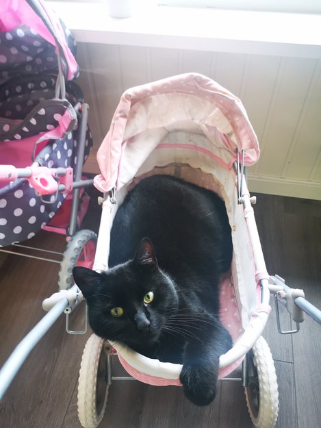 Han har svart pels med en nyanse av brun, noen lange hvite hårstrå innimellom og litt hvit på magen og brystkassen. Han prater masse når han er hjemme, veldig kosete, og ELSKER mat. Stor av vekst.