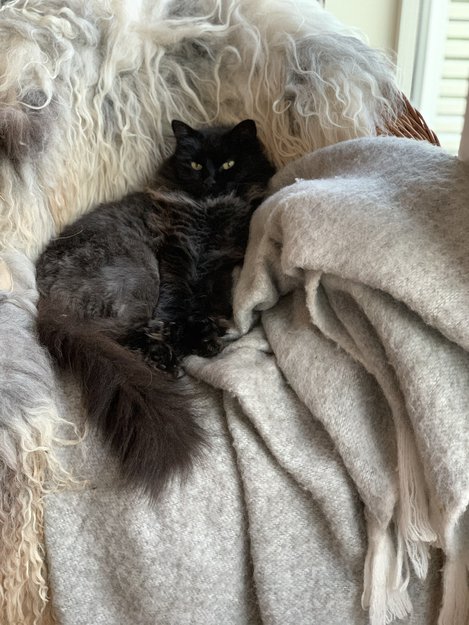 Svart/flekkete pels, nylig klippet. Så har en bustete hale og hår rundt halsen ellers klippet.