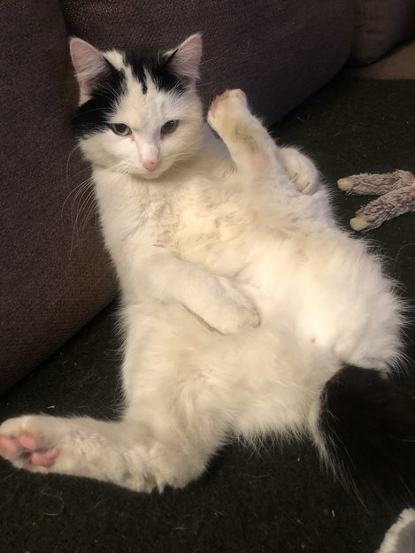 Han har en hvit kropp med sort hale og sorte tegninger på hodet. Han er id-merket og registrert hos Dyreid.no