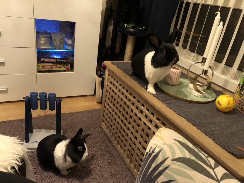 Nina kom seg ut av hageinnhegningen og har oppholdt seg i og rundt hagen vår. Har ikke sett noen tegn til henne i dag. Nina er kaninen nederst til venstre på bildet.