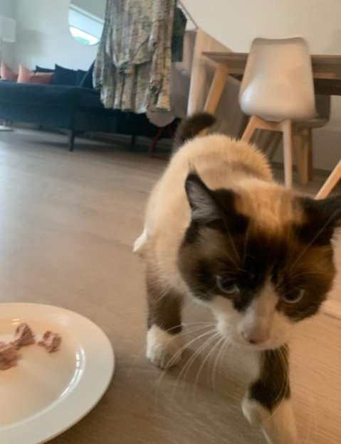 Funnet utafor Vågal Burger i Sogndal. Liten av størrelse, blå auger, har eit sår på halsen, og ser ut til å vere skipskatt.