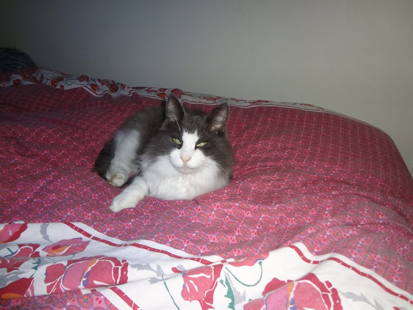 Han er grå og hvit, grønne øyer og mangler en fortann og er kastrert. Han er veldig sky ute,