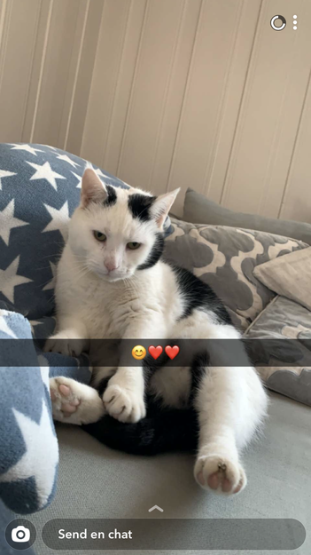 Mons Ferdinand er hvit med sorte flekker, han har en liten flekk på halen hvor han mangler pels fra en tidligere slosskamp. Han er chippet og kastrert. Han er veldig sosial og kosete.