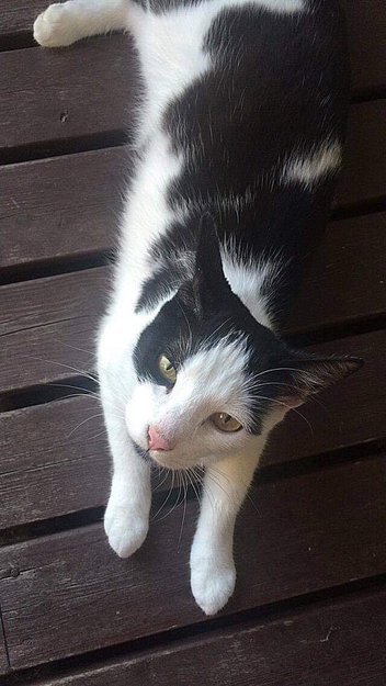 Han er sort og hvit. Ganske stor og butt (hvertfall da han dro). Har en liten vom som slenger litt når han går. Ofte har han skille rundt nakken etter halsbåndet, men siden han mistet det for to uker siden kan det være borte. Han har ofte svart 'gøgg' rundt øynene og nesen. Han er veldig kjælen og ikke særlig menneskesky.