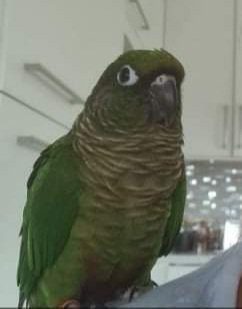 Han har en svart ring på foten. Har en gul og grønn hale og hodet hans er grønt og han har en lyse grå bryst