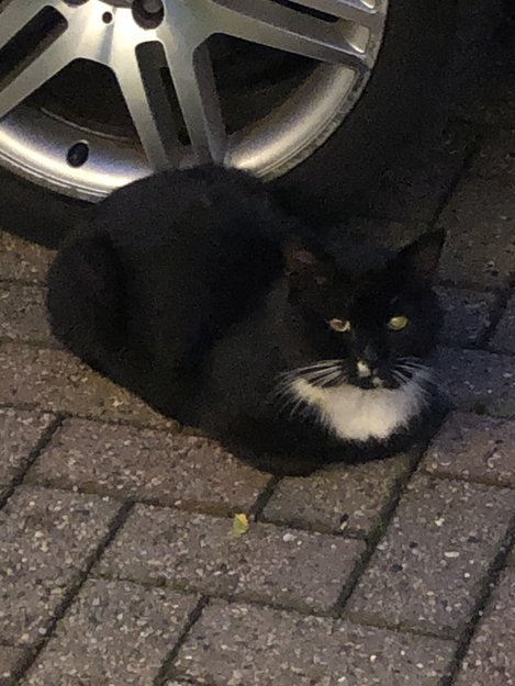 Første gang jeg så den så miauet den helt sykt høyt og lenge ute, fikk med engang en mistanke på at den var savnet. En stund etter så den bra ut men nå i det siste så så den tynnere ut så jeg har matet den ofte. Den er god venn med min katt også. Rolig katt for det meste.