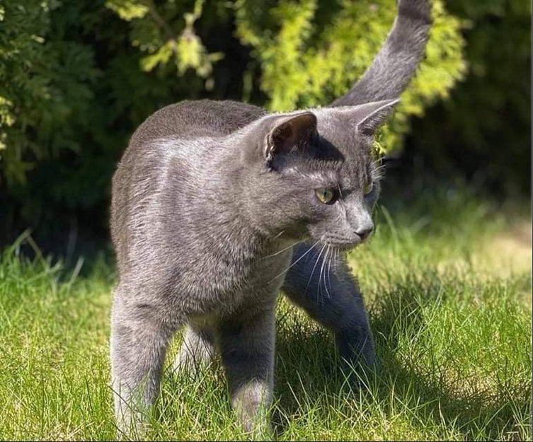 Korthåret, grå katt, åtte måneder, kosete, mjauer en del, leken og nysgjerrig.