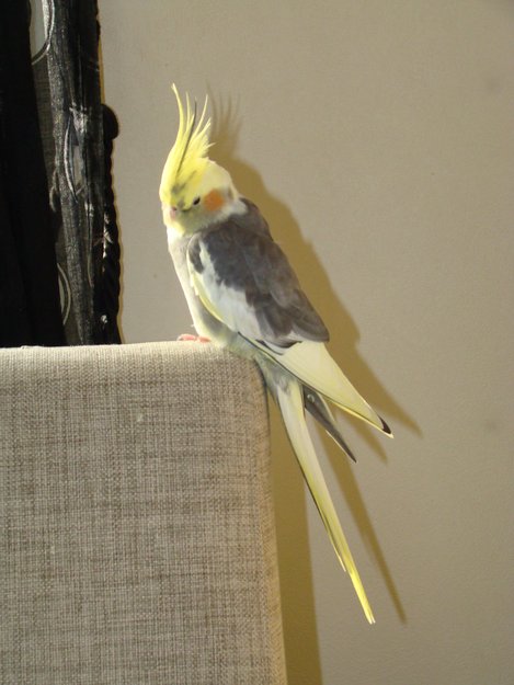 Hun er grå og gul med oransje kinn. Har en gul topp, med en grå fjær i toppen. Hun har litt grått i ansiktet. Nebbet er lyst, med en mørkere strekt på nebbet. Hun er tam.