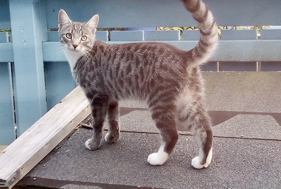 hvit på alle poter har mørkegrå stripe på ryggen og halen
