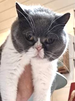 Han er tynn og veldig sulten. Han har mange klumper / knuter av hår og er skitten. Øynene tappes og han hveser. Han fremstår ikke med god helse. Han har en ID brikke, så vi tar ham med til Jevnaker Dyrelege i morgen, og forhåpentligvis kan de hjelpe oss med å finne eieren.