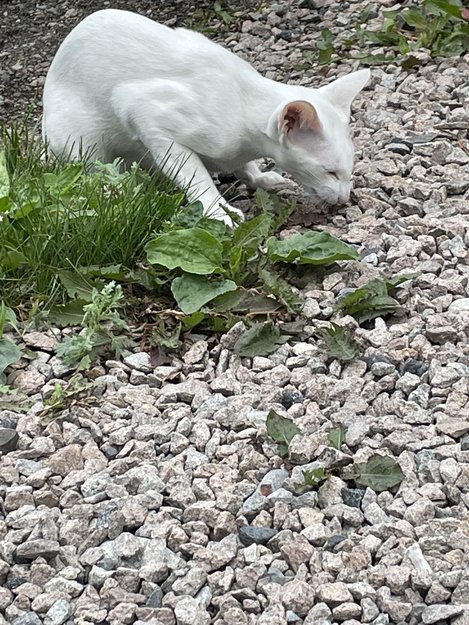 Veldig tam og tynn hvit rase katt går rundt på plassen her