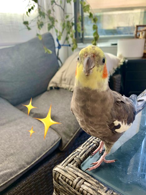 Lily er en viltfarget nymfeparakitt. Altså gult hode med røde kinn. Ellers er han grå med litt hvitt på vingene. Nedre parti (ved bena) så er det litt grå makrell striper