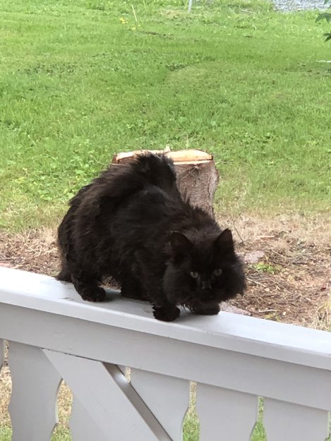 Svart i pelsen, veldig redd katt. Lukter kraftig urin og mangler pels flere steder på kroppen.