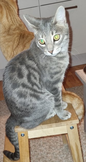 Han er veldig nysgjerrig, ikke redd for noenting og kan ha blitt stengt inne i oppgang, bil eller garasje. Han mjauer mye. Han er slank med kort, fløyelsmyk pels