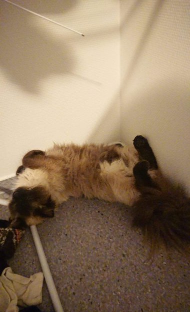 Neva Masquerade. 2 år gammel. Han heter Pluto. Er hundeaktig i lynnet og følger ofte etter folk hjem. Rolig katt med gode innstikter. Kontaktsøkende. Har en dyno tag med telefonnummer rundt halsen.