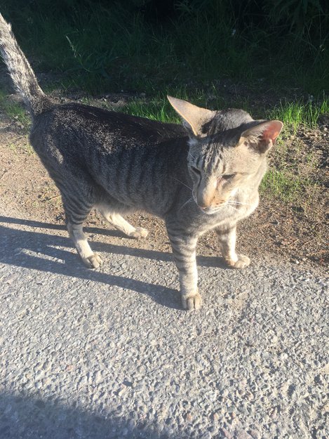 Møtte på katten ved Apalveien i Fetsund. Den kom rett mot oss da vi kalte på den så må være menneskevant, og mest sannsynlig ha et hjem. Katten var veldig kontaktsøkende og vokal, og virket dehydrert og var tynn. Håper den har et hjem og at noen kjenner den igjen.