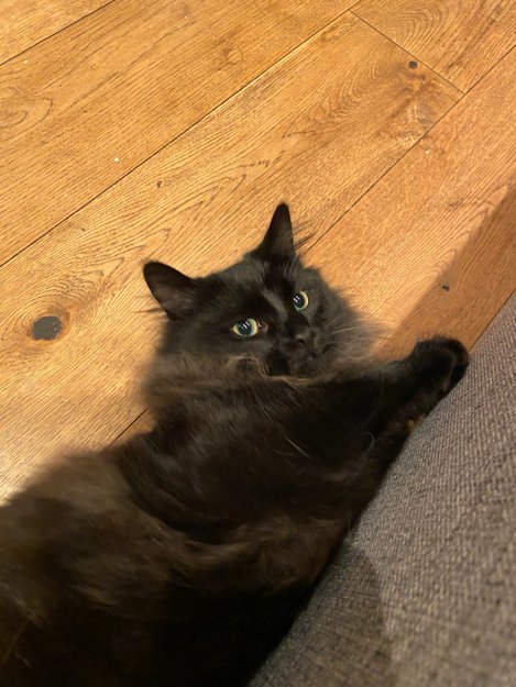 Sort katt, men litt grått i pelsen på brystet og på halen.