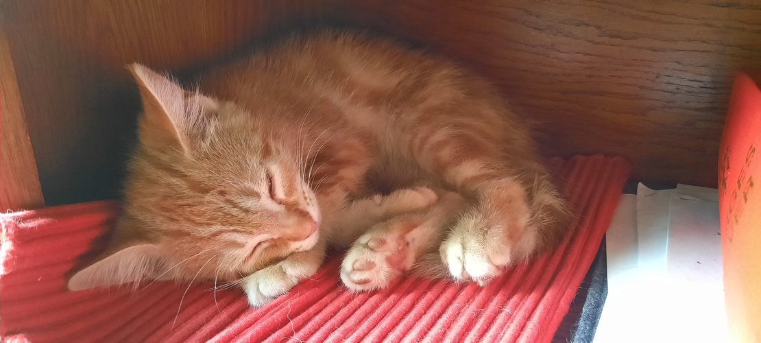 Loke er en liten hannkatt med Orange og hvite tiger striper