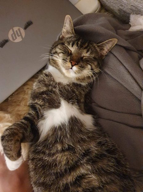 Har kun tre bein, venstre fremfot er amputert. Mjauer mye, er sykt kosete.