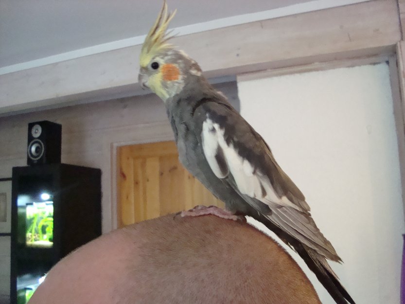 Gråspraglet nymfeparakitt, oransje kinn, gult ansikt.