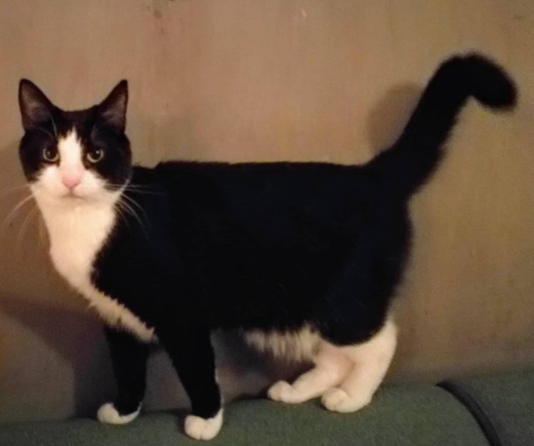 Sort og hvit i ansiktet, symmetrisk. Hvite bakbein, hvite poter på forbein, hvit mage.