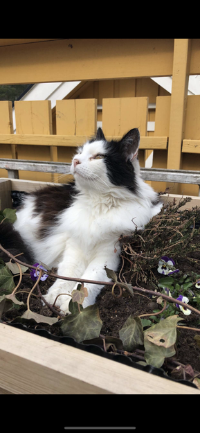 16 års gammel langhåret katt med svart og hvit pels. Helt grønne øyne og sånn passe stor. Hvit på magen og svart på ryggen, helt svart hale.
