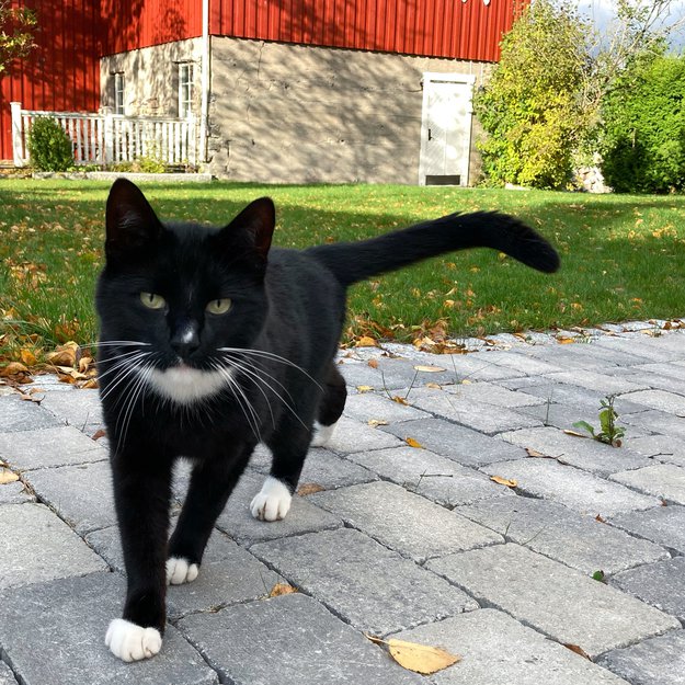 Snart 8 år gammel hann katt. Ganske stor type. Litt sky, stopper gjerne 80-100 cm fra deg for kos. Han er hvit under magen, under haka og på alle fire potene. En hvit prikk på nesa.