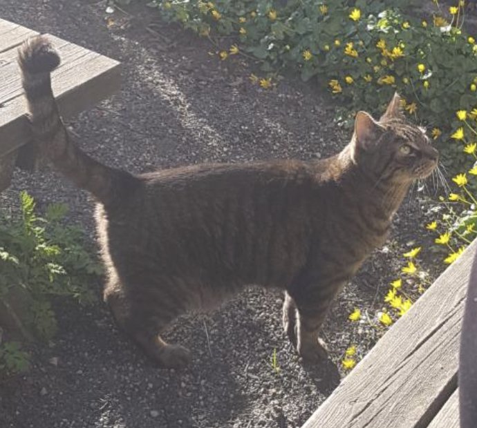 12 år gammel, grå/brun/svart stripete med en hvit flekk på brystet. Rundt 6 kg. Nysgjerrig og vennlig, kan godt tenkes at han har villet utforske en spennende kjeller.