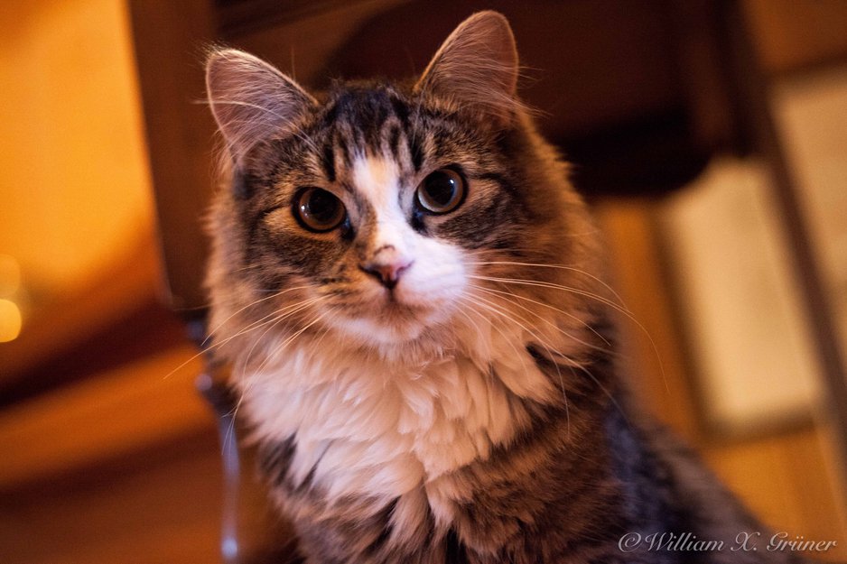 Grå brun stripet med hvit nese, bryst og hvite poder.