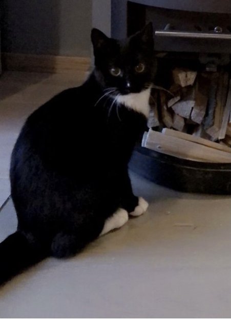 Svart med hvite poter. Liten hvit flekk på nesen. Veldig kosete.