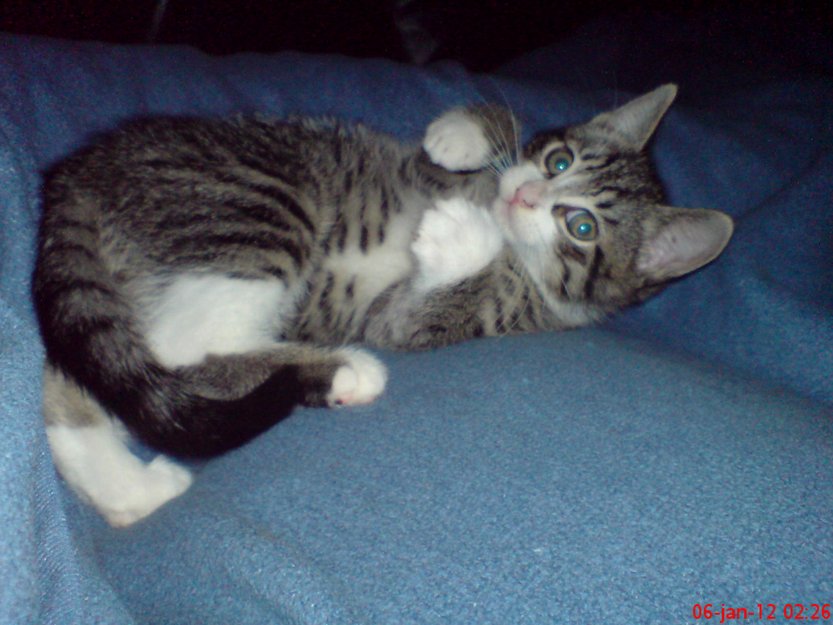 Pusur er snart 7 mnd. Pelsen hans er spraglete med svarte striper, korthåret og helt glatt. Han er lang i kroppen. Pusur er veldig kosete.
