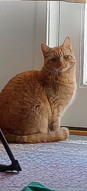 Oransje med beige striper, begge forlabbene er litt barbert etter veterinær besøk noen uker siden.