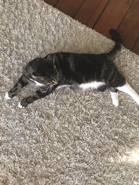 Katten har hvite poter, er hvit under haka og på magen. Den er kontaktsøkende og kjelen.