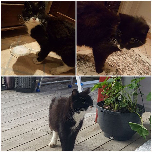 Svart og hvit, svært avmagret katt oppsøkte hus. Veldig kontaktsøkende og kosete.