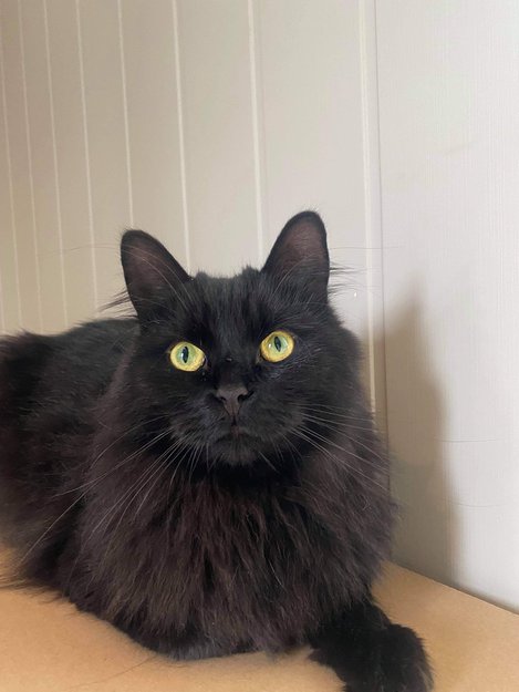 Slank, langhåret, svart, litt hvit nederst på magen, to farger på øyne - gul/grønn