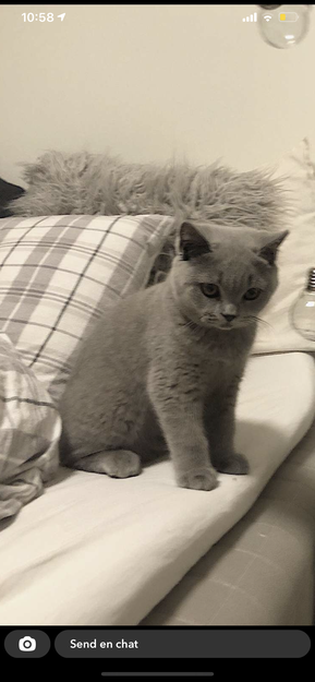 Han er en britisk korthår med grå pels og store øyne. På den ene foten foran har den et barbert område etter at han fikk narkose for å kastreres.