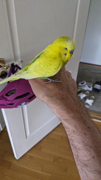 Veldig tam, tofarget primært gul men også litt grønn på brystet og under vingene.