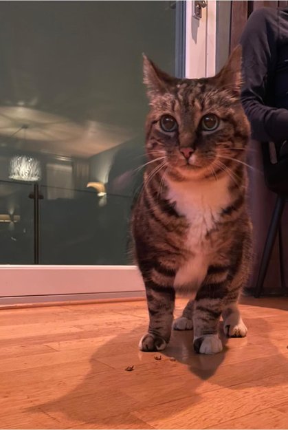 Har en hvit flekk på (kattens) venstre siden av neseboret, hvitt bryst og hvitt på potene. Har tattovering i øret, er chippet og kastrert.
