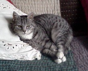 Selma er ganske lita og nett, er symmetrisk tigerstripet (grå/svart), har hvite poter, svarte tredeputer og lysere pels på mage/hals. Hun er ganske sky og skvetten av seg. Hun har både chip og er øremerket.