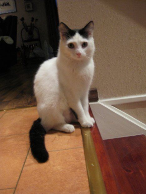 Hvit med svart "hatt" og hale. Svart flekk på venstre side bak. Litt svart på baksiden av høyre fremben.