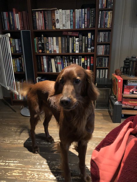 Vanlig str irsk setter hanhund, med ridge oppe på hodet. Grønt halsbånd. Leken.