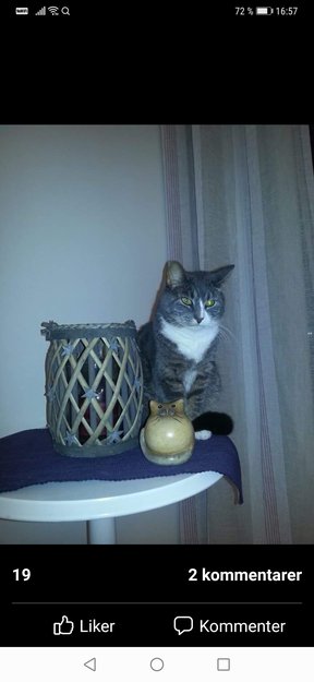 Liten. 3.5 kg. Lodden pels. Litt striper. Hvitt bliss, men halve nesa er grå. Hvite sokker. Hvitt bryst og buk. Litt gyllent i pelsen nederst på magen. Gyllene markeringer rundt øyne. Forsiktig. Mjauer lite. Mere som knirking.